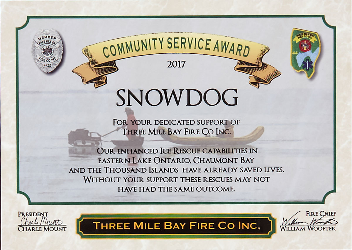 Snowdog has received a Community Service Award from a Fire Department, who has been using their machine for search and rescue.